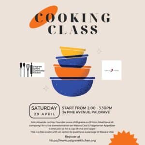 « All Events This event has passed. Cooking Class – Masala Chai and Vegetarian Appetizer Demonstration April 29, 2023 @ 2:00 pm - 3:30 pm « Chair Yoga (Gentle) Spring Session 2023 Fridays March 3rd – May 19th 2:00 – 300 pm Chair Yoga (Gentle) (Spring Session 2023 ) Mondays March 6th – May 29th 2:00 – 300 pm » Add to calendar Google Calendar iCalendar Outlook 365 Outlook Live Details Date: April 29, 2023 Time: 2:00 pm - 3:30 pm Venue Palgrave United Church 34 Pine Avenue Palgrave, Ontario L7E 0L9 Canada + Google Map Phone 905-880-0303 Organizer Palgrave United Community Kitchen Phone 905 880 0303 Email info@palgravekitchen.org View Organizer Website Recent Posts Creative Food Workshops March Break Baking Camp 100 Women Who Care Caledon Support Community Cooking Club Wreath Making with Darlene Preserving Workshop October 25, 2025